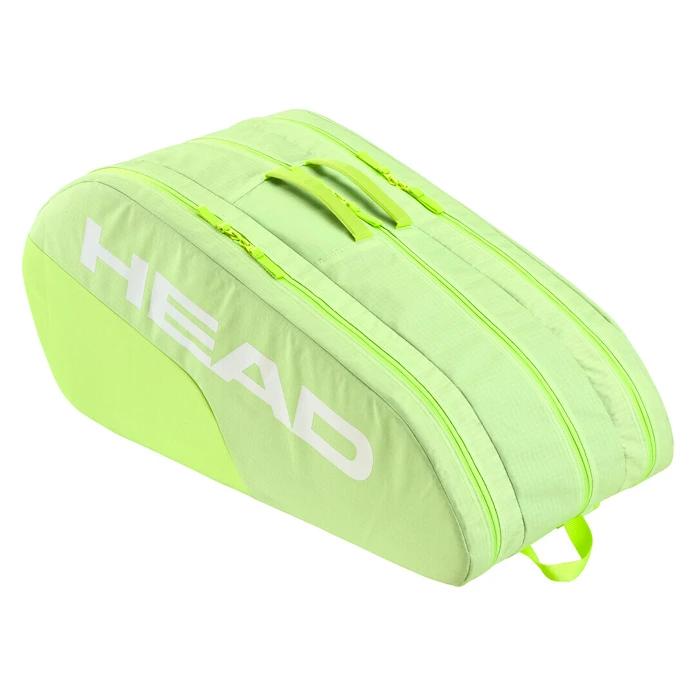 De nieuwe, stijlvolle en ruime Head Base Racket Bag L in de basiskleuren geel en groen, beschikt over drie hoofdvakken, een kleiner accessoires vak aan de buitenkant van de tas en over twee verstelbare schouderbanden.