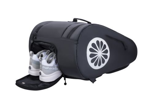De The Indian Maharadja Padel Bag Platinum PXLR Black is een zeer ruime en stijlvolle padeltas in de zwart. De tas beschikt over 2 ruime hoofdvakken, 2 kleinere accessoiresvakken, een apart schoenenvak, een handvat en 2 schouderbanden.