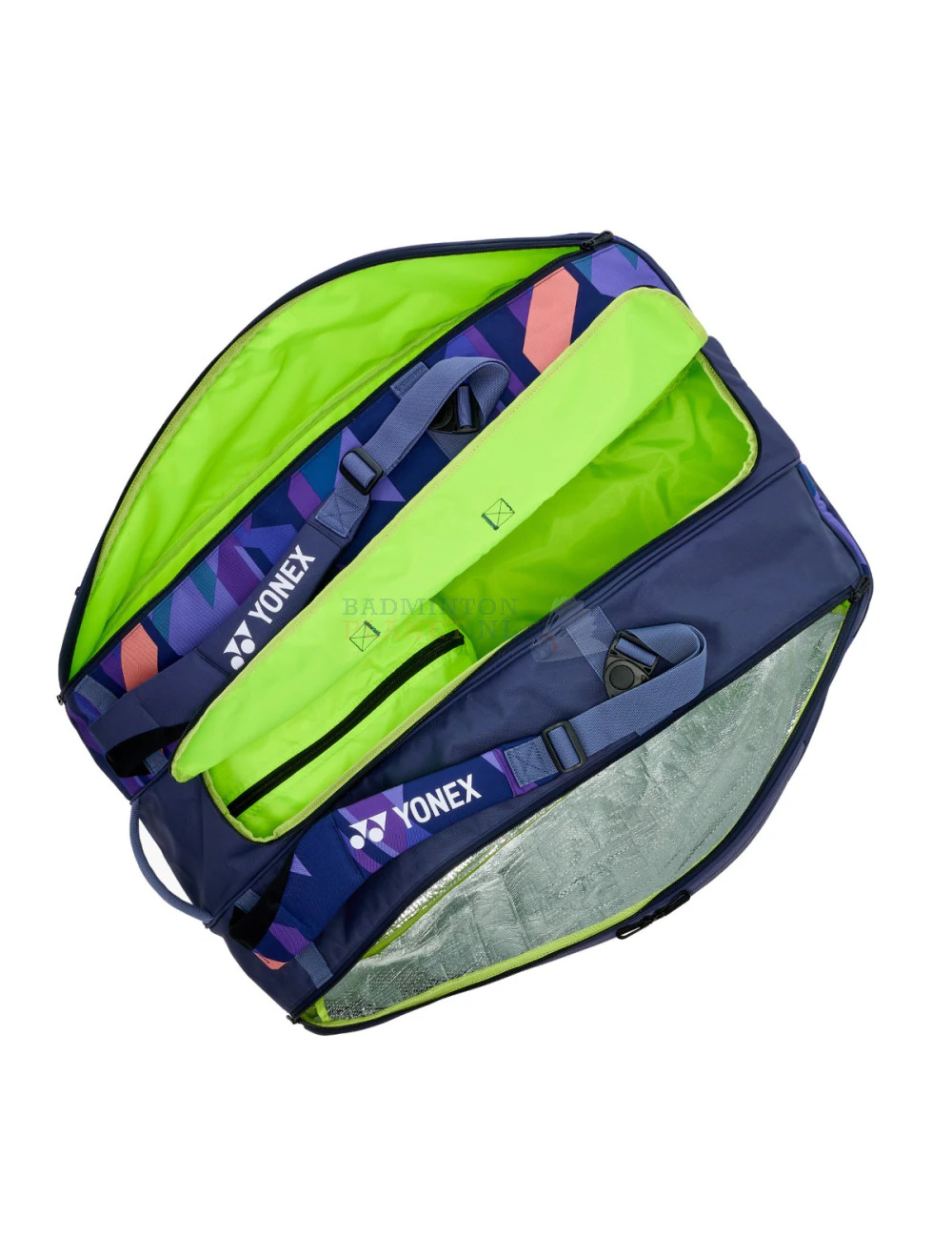 Deze nieuwe, stijlvolle en zeer ruime Yonex Pro 924212 Racketbag in de basiskleur midnight navy beschikt over 3 zeer  ruime hoofdvakken, twee kleinere zijvakken, een schoenenvak en over 2 verstelbare schouderbanden.